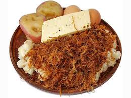 deshidratada y fritada; se acompaña con maíz cocido (mote), huevo duro, papa